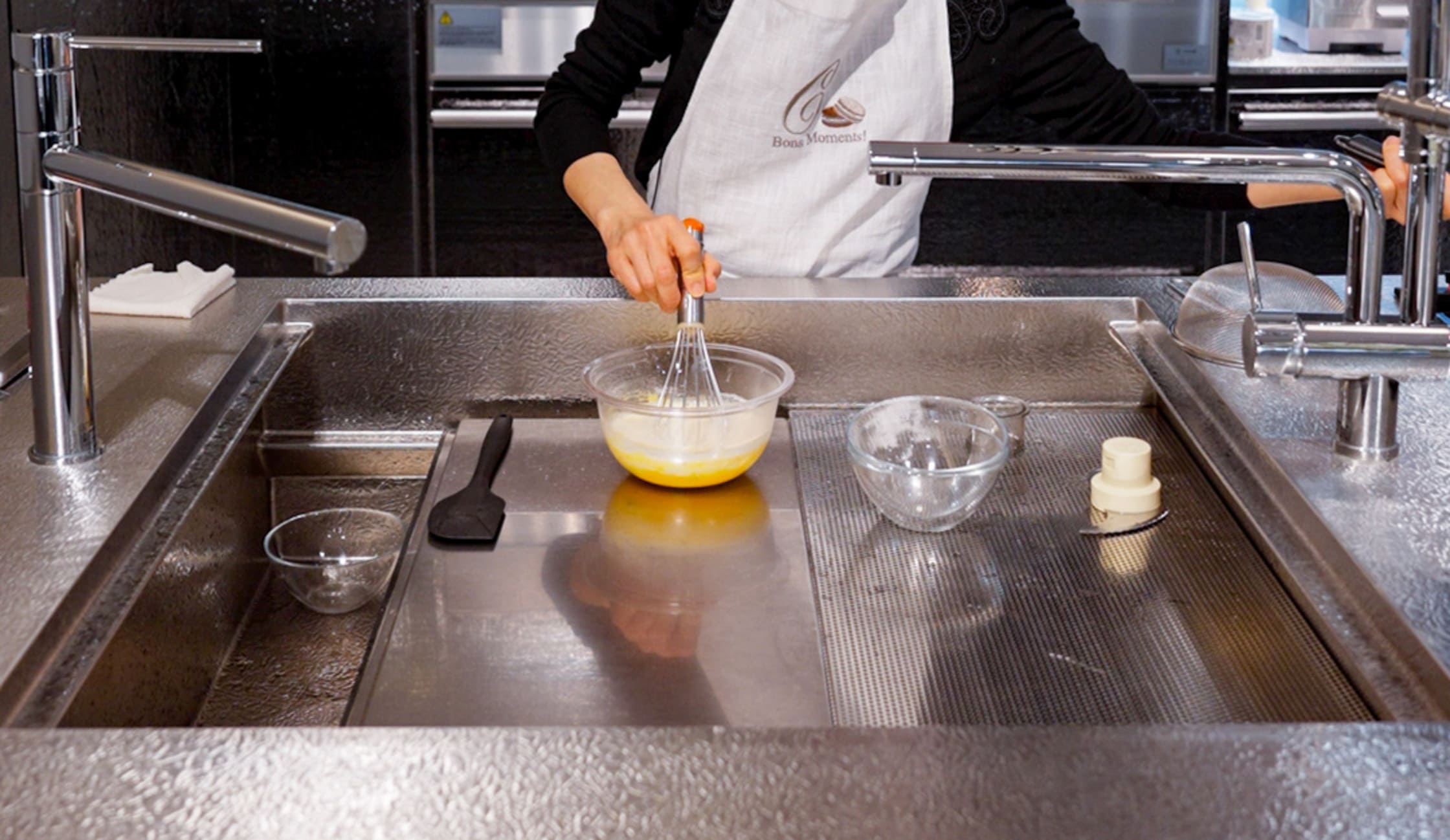 パラレロシンクであれば、シンク内の広い作業スペースで楽に作業ができ、漉した網やボールはシンク内にすぐに片付けられ、作業がはかどります。