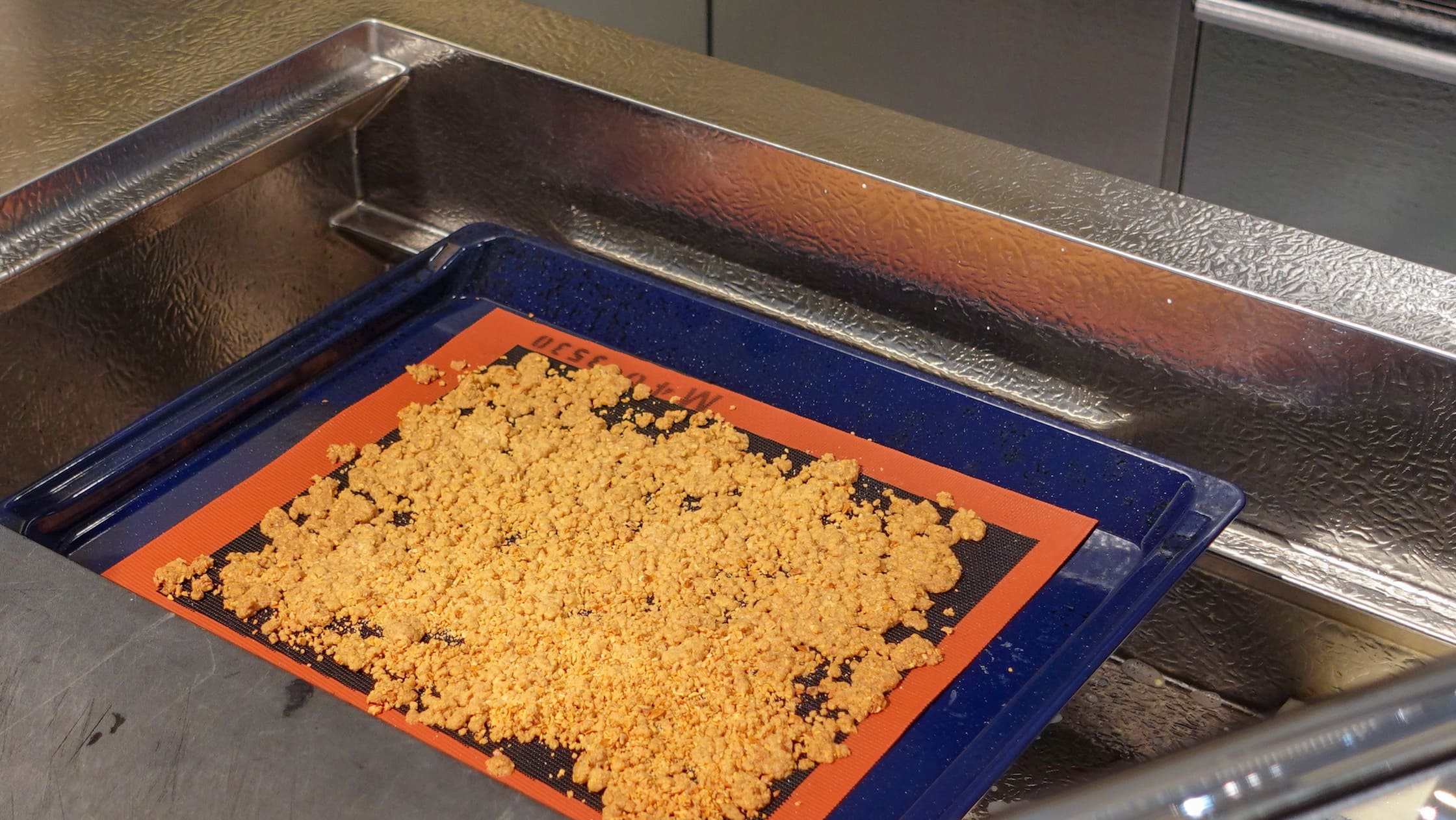 オーブンからトレイを取り出し、シンクの広いまな板に、オーブンごと、そのままスライドさせて取り出すと便利です。