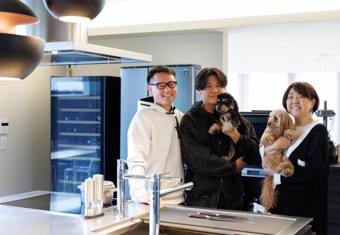 モダンフレンチをベースにジャンルを横断する料理で支持を集め、フランス発祥のレストランガイド「ゴ・エ・ミヨ」にも継続して掲載される実力派シェフ・下野昌平様。自宅でも積極的にキッチンに立ち、家族や仲間に料理をふるまうことを楽しんでいる。セカンドキッチンの前で、ご家族との和やかな一枚。