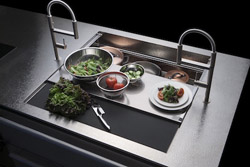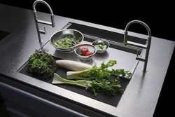 野菜を洗う、切るなどの作業は、まな板と水切りもできるマルチプレートをつかって簡単に行えます。シンクの横幅を目いっぱいつかうことができ るので、大きな葉物野菜やネギやごぼう、フランスパンなどの長ものの調理もスムーズです。